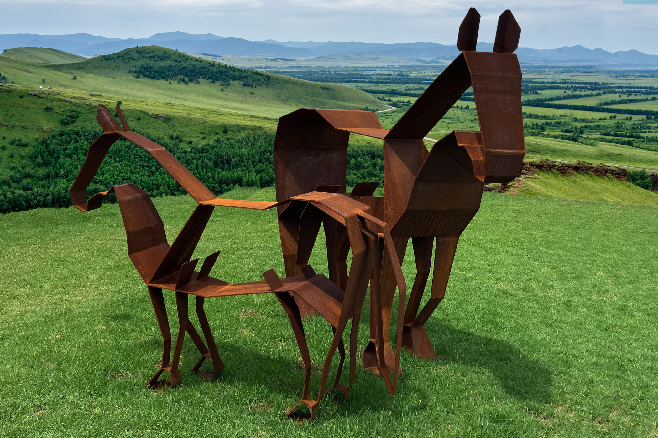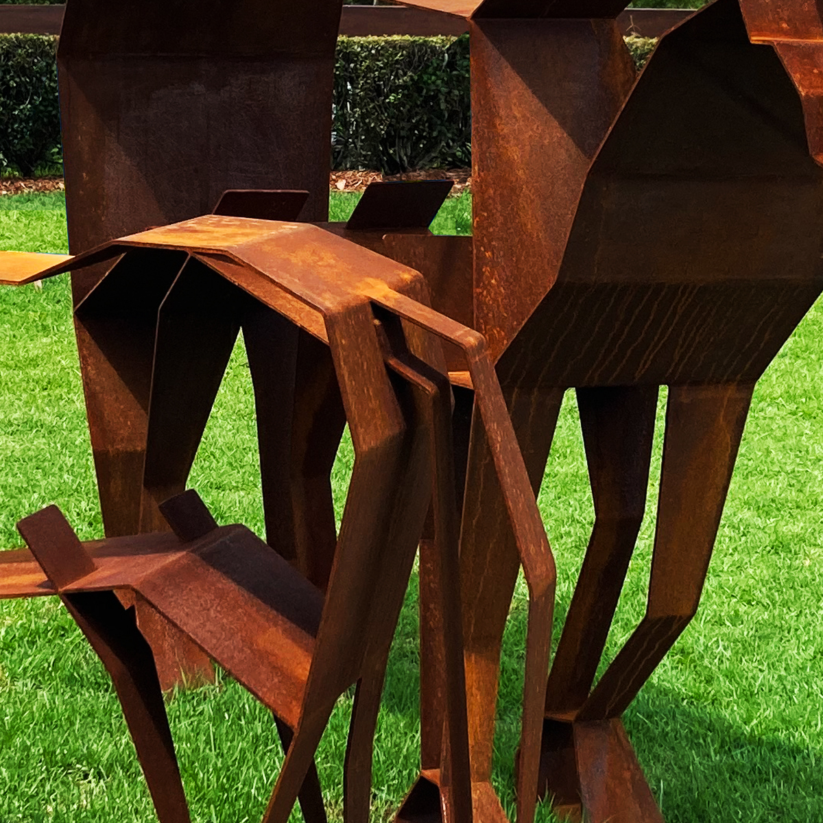 "Equestrian Fusion" is a steel outdoor artwork that captures the graceful power and spirit of horses through a modern, dynamic, and abstract interpretation. The composition of the artwork is a harmonious interplay of fluid lines and geometric angles. From a distance, the viewer is drawn to the overall appearance of the horses, their forms morphing into one another, suggesting a sense of unity and shared purpose.